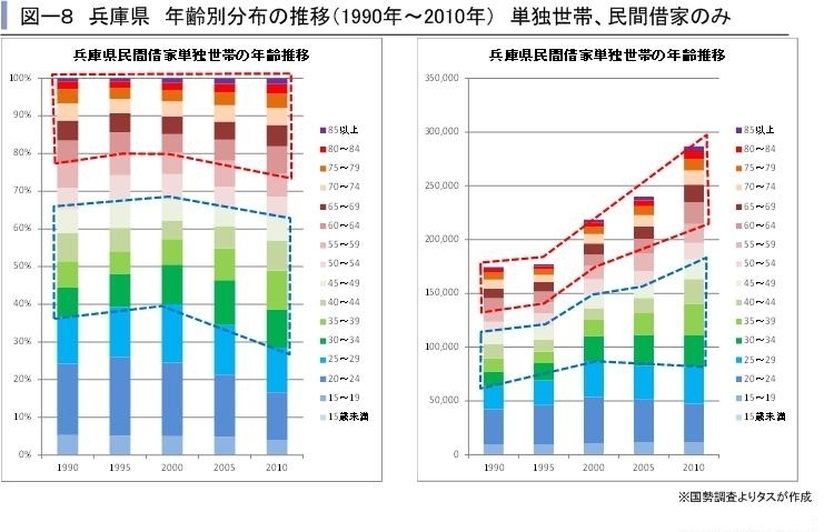 また関西圏版では「年齢別人口分布から見た兵庫県の住宅市場の変化」および「2012年9月期の2府1県賃貸住宅指標(空室率TVI(タス空室インデックス)、募集期間、更新確率、中途解約確率、賃料指数)」を掲載しています。