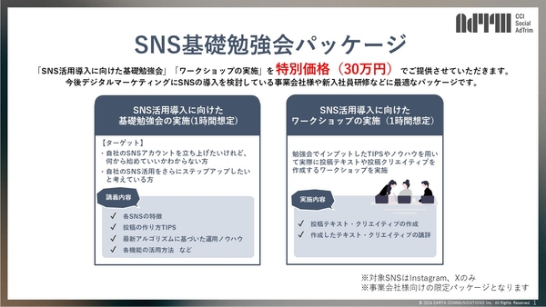 投稿企画の考え方からクリエイティブの作り方に関するTIPS、各SNSのアルゴリズムに加え、過去の炎上事例やインフルエンサー活用の際の注意点など、すでにSNSを活用している企業様向けの内容も含まれております。新入社員研修などにも最適なパッケージとなっておりますので、是非ご活用ください。