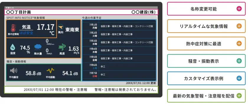 さらに気象情報だけでなく、一週間の予定、お知らせ、静止画、動画等の多種多様なコンテンツを複数表示することが可能です。例えば、工事現場であれば気象情報と同時に一週間の作業工程表や騒音、振動情報なども表示させることで、作業員や通行人に向けた情報を視認性良く配信できます。また、周辺環境との親和性も考慮したスタイリッシュなデザインが特徴です(意匠登録出願中)。