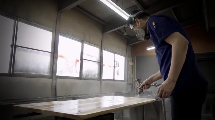 杉の天板にクリア塗装をしている様子