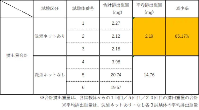この度、その認証商品の1つである洗濯ネットにおいて、マイクロプラスチック研究の第一人者である、京都大学地球環境学堂准教授 田中 周平氏との共同研究を実施し、認証洗濯ネット利用により、洗濯で流出するMPFの排出重量を85%以上*1除去できることを確認致しましたので、発表いたします。(*1:洗濯ネットあり・無しの各試験体からの1回目/5回目/20回目の排出重量の合計から算出)