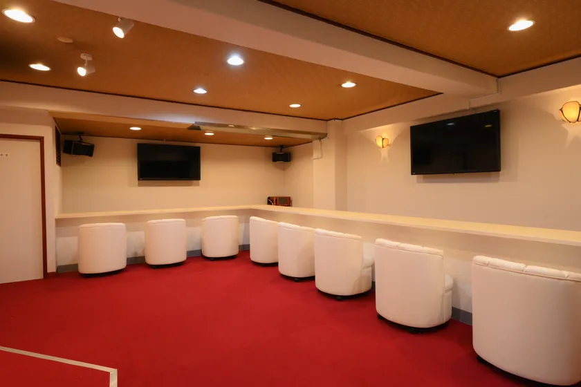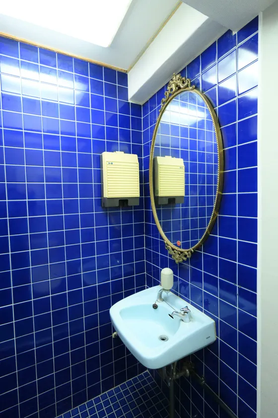 「ガールズスナック花」の物件は契約当時、床が腐り、天井は雨漏りがしていました。フルリノベーションが必要な状態でしたが「昭和の風合いの残る趣のある内装を壊してなくしてしまうのはもったいない」という気持ちが、床の赤いカーペットや一部のカウンター、トイレの青いタイル張りや照明のブラケットなど、残せる内装は残し、必要と思われる部分のみ手を加えたリノベーションスナックとして生まれ変わらせました。