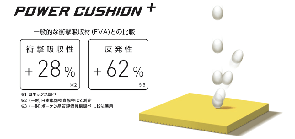 弊社独自の衝撃吸収性と反発性を併せ持つ衝撃吸収素材パワークッション。パワークッションに反発性の高い特殊樹脂を添加し、格子状に+型の溝を最適な間隔と深さで配置した新構造を採用した「パワークッション®プラス」は、従来の軽量性を保ちつつ、衝撃吸収性を28%※2、反発性を62%※3向上させ(一般的な衝撃吸収材[EVA]との比較)、12mの高さから落とした生卵が、割れずに6m以上跳ね返る新衝撃吸収反発素材です。