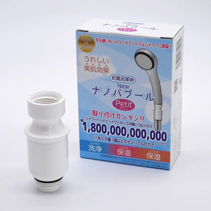 今回、新たに開発・設計を行い、簡単に取り付け出来、サイズを小型化した上でナノバブルの発生量を増やした新製品『お風呂革命 New ナノバブール プチ(Petit) シャワーヘッド用』を販売する事となりました。近年ナノバブル(ウルトラファインバブル)シャワーを謳った製品が多く販売されていますが、まだまだ高価な商品が多く、ナノバブルは気になるが気軽に手を出せないという方が多くおられます。また、お気に入りのシャワーヘッドのままナノバブルシャワーにしたいと言うご要望もお聞きします。『お風呂革命 New ナノバブール プチ(Petit) シャワーヘッド用』は誰でも気軽に購入できる価格で、より多くの方々にナノバブルの効果を体感していただきたく開発した製品です。