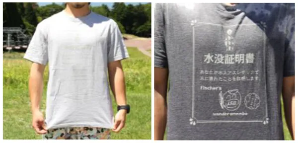 「フィッシャーズ」のメンバーであるンダホさんが考案した、水上アスレチックがテーマのユニークTシャツです。水に濡れると水没証明書のデザインが出現するアイデア。証明書にはンダホさんの複製サイン入りです。