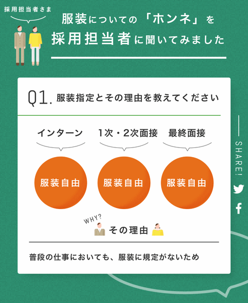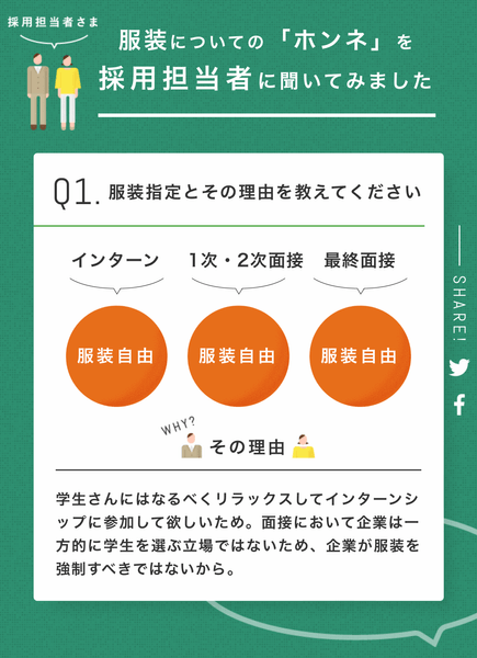 今回リニューアルをするサイトでは、選考時の服装について“服装自由”とアナウンスする企業に対する、就活生のまっすぐな問いを使ったメッセージ性のあるキャッチコピーを掲げています。就活生から集まった様々な声をカラフルな色で表現したページデザインとなっており、プロジェクトがこれまでに取り組んだ活動記録も紹介しています。