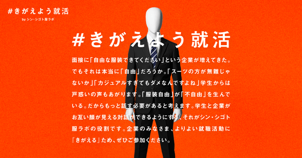共創コミュニティ「シン・シゴト服ラボ」は、就活生の服装における課題解決を目的に「#きがえよう就活」プロジェクトを進めています。就活の際の服装を『これ“が”いい』と選ぶことのできる社会を目指して、さまざまな業種の賛同企業と共に特設サイトにて情報を発信し、活動していきます。