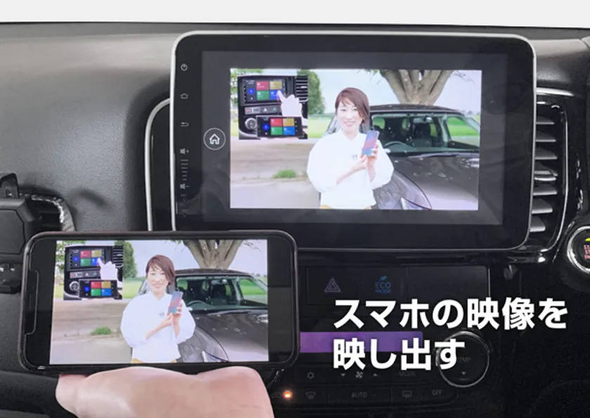 ミラーリングは有線・無線に対応しており、接続用のケーブルが無くても無線で映像伝送ができます。また、AndroidとiPhoneの両方でご使用いただけます。