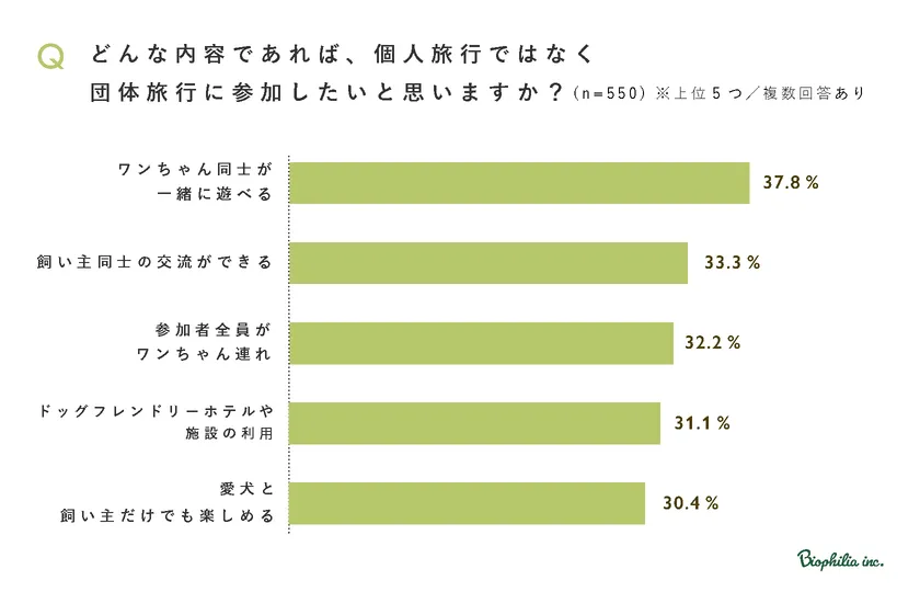 また、個人旅行ではなく団体旅行に参加したいと思う内容を調査した結果、「ワンちゃん同士が一緒に遊べる(37.8%)」「飼い主同士の交流ができる(33.3%)」「参加者全員がワンちゃん連れ(32.2%)」といった、交流を目的とした回答が上位を占めました。(※3)