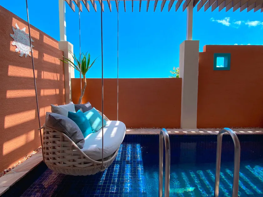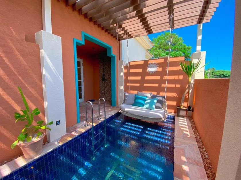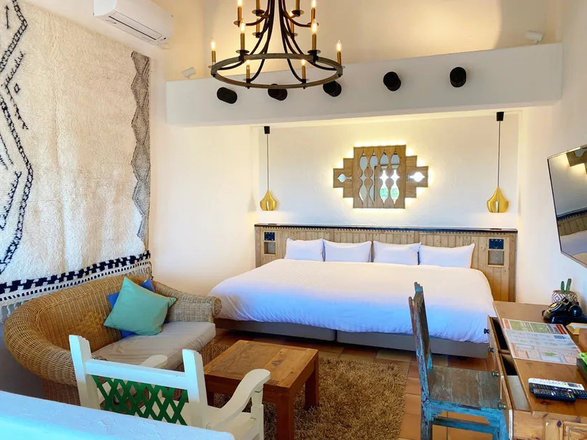 サンタフェの建築様式やライフスタイルをイメージし、素材感のある手作り家具やファブリックで整えました。テラスには美しいタイルを貼ったプライベートプールを備え、水上には心地いいソファのようなブランコが吊り下げられています。ここに座って足をチャプチャプさせながら、おしゃべりしたり、大きな空を見上げたり…。心ゆくまで、たっぷり癒やされていただけます。