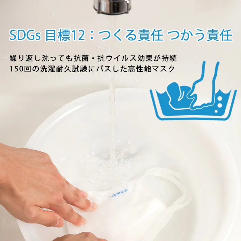 そのひとつが、「SDGs目標12:つくる責任 つかう責任」に直結する、洗濯耐久性にすぐれた抗菌・抗ウイルスマスクです。