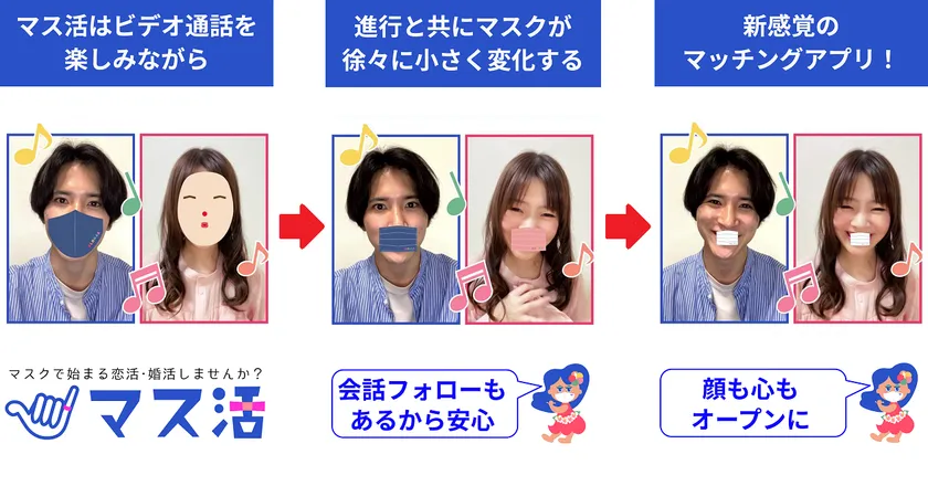 株式会社アロハー(本社:神奈川県横浜市 代表取締役:石原 鉄兵)は2022年8月12日、バーチャルマスク必須でビデオ通話を開始、進行と共に徐々にマスクが小さくなるマッチングアプリ「マス活」をリリースします。