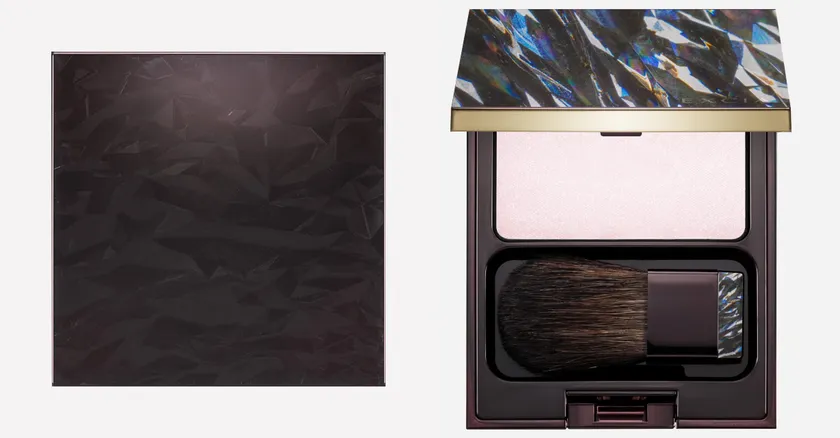 反射角度で表情の異なる「加飾レス成形」を施した化粧品容器の天面(サンプル)