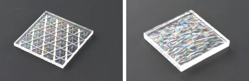「加飾レス成形」は、材料固有の特性を活用することで透明樹脂内部に3D模様を浮かび上がらせます。これにより独創的なデザインを可能にします。また、光の加減や見る角度によって輝き方に変化をもたらす特殊な反射テクスチャーを実現します。なお、形状のバリエーションは無限で、自動車の内装、住宅の内装、化粧品の容器などで各社のオリジナリティを表現することができます。