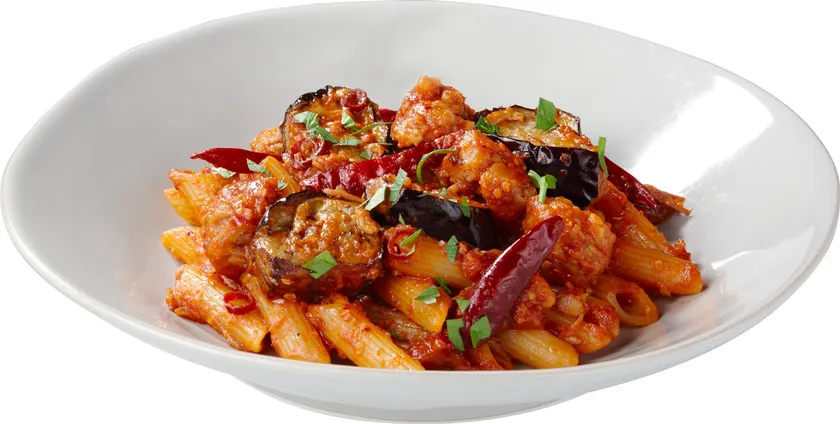 自家製ハーブサルシッチャと揚げナスの激辛トマトソースペンネ