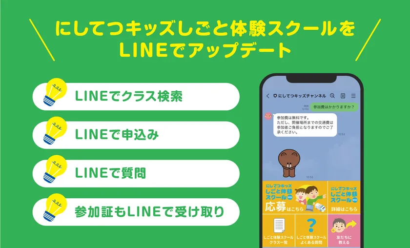 本年より、本イベント含む西鉄グループの、お子さま向けのイベント情報や、保護者さま向けのお得な情報の発信ツールとして、にしてつキッズチャンネルLINE公式アカウント(LINE ID:@224odqsv)を開設し、本日より開始する「にしてつキッズしごと体験スクール」の応募受付や問い合わせ対応をLINE上で行います。