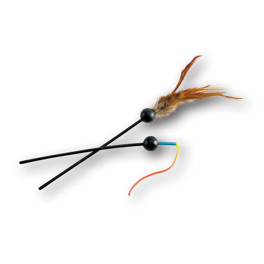 「キャッチ・ミー・イフ・ユー・キャン2」には“羽根スティック”と“ひもスティック”が1本ずつ付属しています。猫からの人気が高く、劣化が速いスティックについては、交換用スティックを別売にて、販売しております。