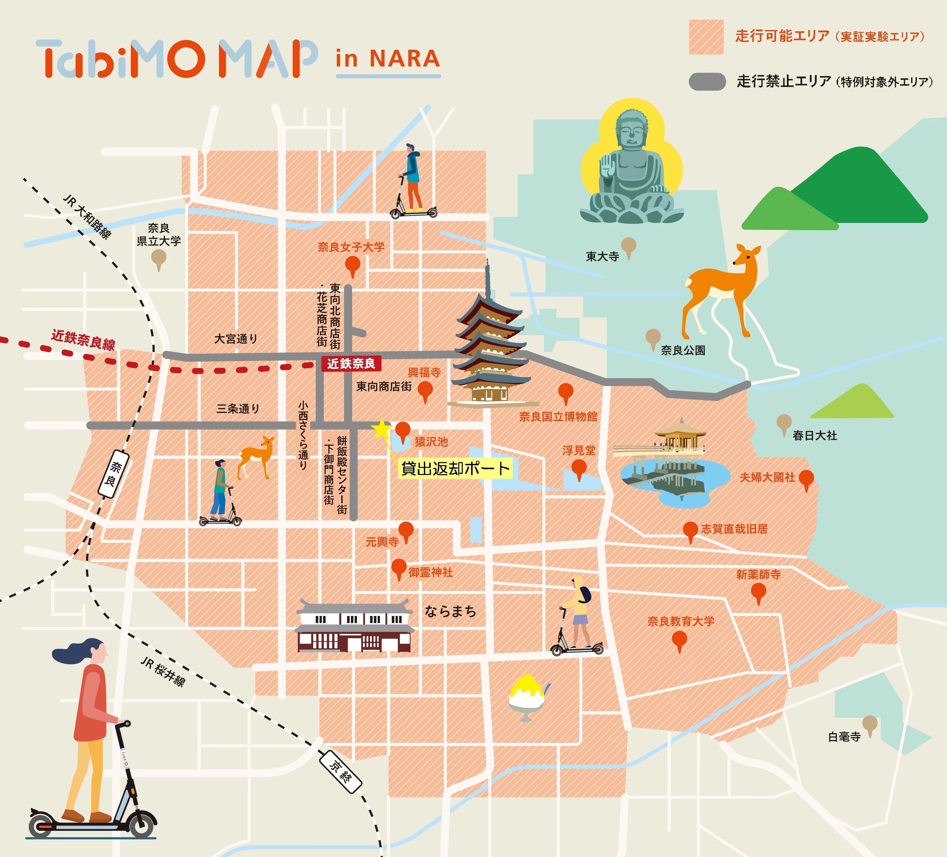 今回の実証実験エリアである奈良市中心地は、歴史を感じられる神社仏閣や観光スポットが点在していることから、徒歩に比べ、電動キックボードを利用することで、より効率的に周遊することができます。電動キックボードは、立ち乗りスタイルであることから乗車時に目線が高くなり、爽快に移動をお楽しみいただけます。