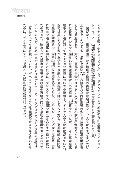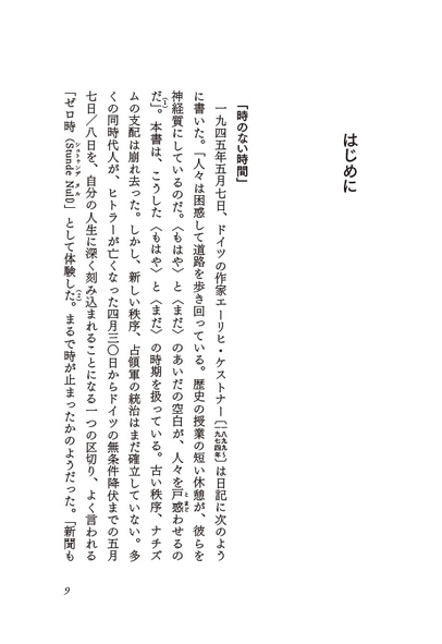 ドイツ語で「シュトゥンデ・ヌル(零時)」と呼ばれる空白の8日間。それは欧州における第二次世界大戦の最終幕であるとともに、その後のヨーロッパの「起点」となった。その渦中に生きた人々の日記や回顧録から時代の断層を活写する快著、登場人物500人超、全512頁。