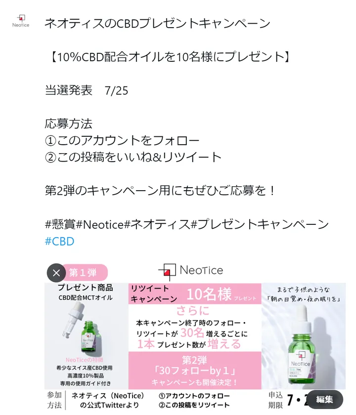 カラダの「回復機能」と「エイジングケア」に注目した サプリメントブランドのネオティス(Neotice)が7月25日まで CBDオイルのフォロー&リツイートキャンペーンを実施