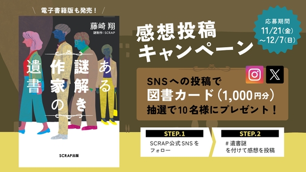 電子書籍配信開始を記念し、SNSでの感想投稿キャンペーンも実施します。期間中、『ある謎解き作家の遺書』の感想(書籍版、電子書籍版問わず)を「#遺書謎」のハッシュタグを付けてInstagramまたはXに投稿すると、抽選で10名様に図書カード1,000円分をプレゼントします。