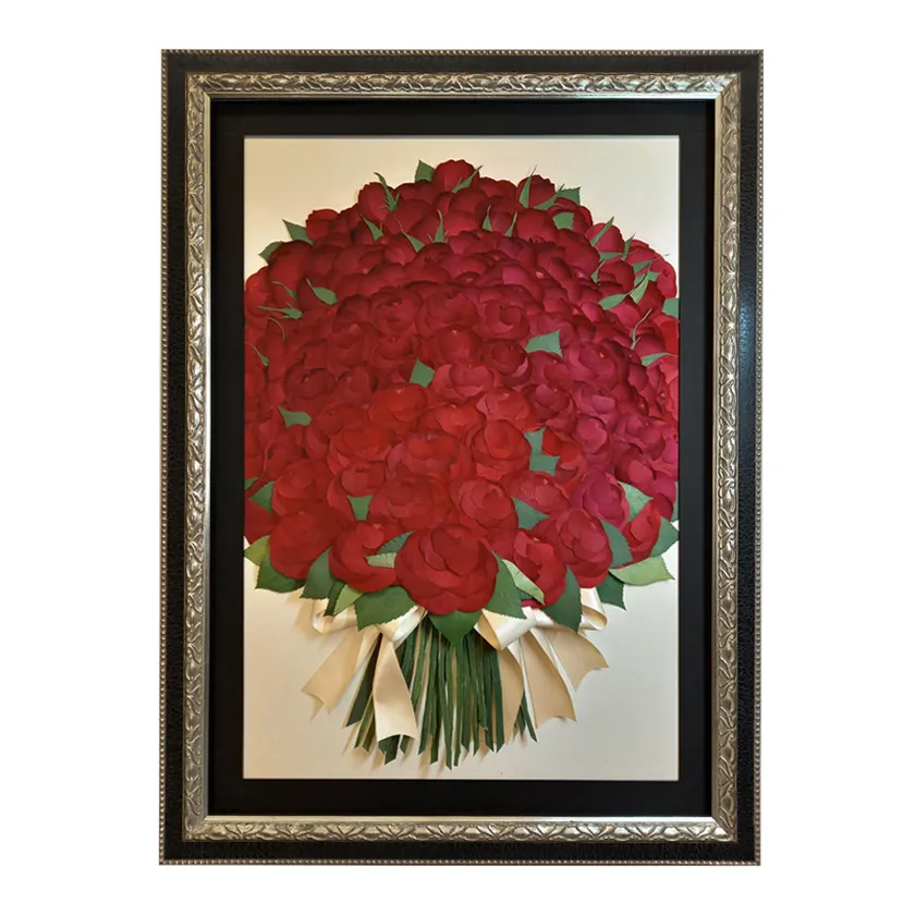 押し花とボトルブーケ、両者のメリットを併せ持つ保存方法が「3Dブーケ」です。ボトルブーケと同様に乾燥剤による花への加工を施すことで、花本来が持つ色や形状を30年以上楽しめます。また、花束の形を額縁に残すことができるため、108本のバラの圧倒的な華やかさがそのままインテリアに反映されます。