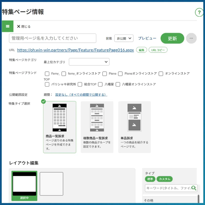 「特集コラム作成機能」の魅力は、デザイン知識がなくとも自由自在にページ作成ができることです。ページのパーツテンプレートがいくつかあり、文字や画像などを設定するだけで簡単にページが作成できます。商品の特徴をアピールできることだけでなく、商品購入までのシームレスな販売導線を作れることが強みです。さらに特定のお客様のみのページ公開も設定が可能なため、特定の会員様限定に向けた感謝祭などのお知らせページも作成ができ、顧客ロイヤリティの向上にもつながります。特集コラム作成機能は今後もアップデートを予定しており、更なる販促施策や他ブランドとの差別化を実現します。