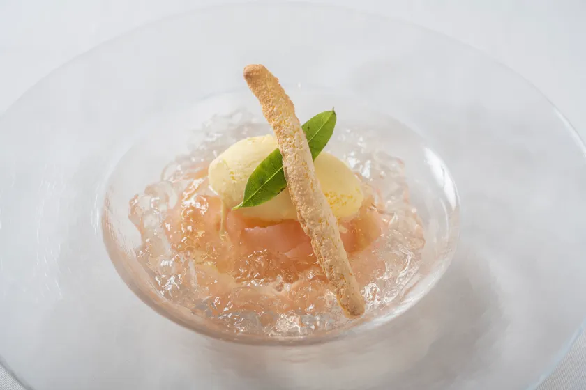 ポシェされた桃にハーブティーのジュレと府中高野さん家の卵を使ったバニラアイスクリームを添えて。