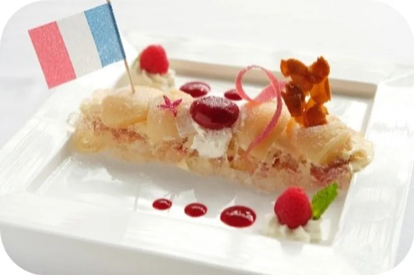 スポンジ生地に白桃のジュレ、バニラアイスクリーム、白桃のコンポートを並べてレイヤーに。アーモンドチュイルとラズベリーのクーリーをあしらって華やかなガトー仕立てに。