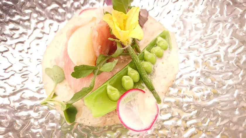 牛肉に下味で醤油を塗り60度の湯で霜降り、氷水に落とし水気を拭い、桃を適宜、包丁して牛肉で巻き、器に盛り付けています。胡麻クリームをかけて花穂紫蘇を散らしました。