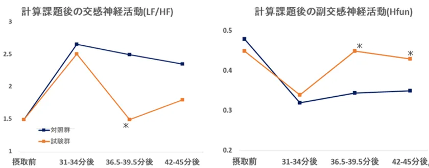 マルトデキストリン含有チョコレートとGABA28mg含有チョコレートをそれぞれ単回摂取し、精神的ストレスがかかる作業負荷後の交感神経と副交感神経の活動を評価