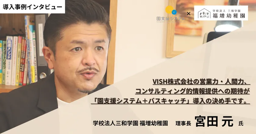 VISH株式会社(所在地:愛知県名古屋市、代表取締役社長:田淵 浩之)は、幼稚園・保育園・認定こども園の園業務負担軽減を支援するICTツール「園支援システム+バスキャッチ」を導入した学校法人三和学園 福増幼稚園(所在地:千葉県市原市、理事長:宮田 元)の導入事例インタビューを無料公開したことをお知らせします。