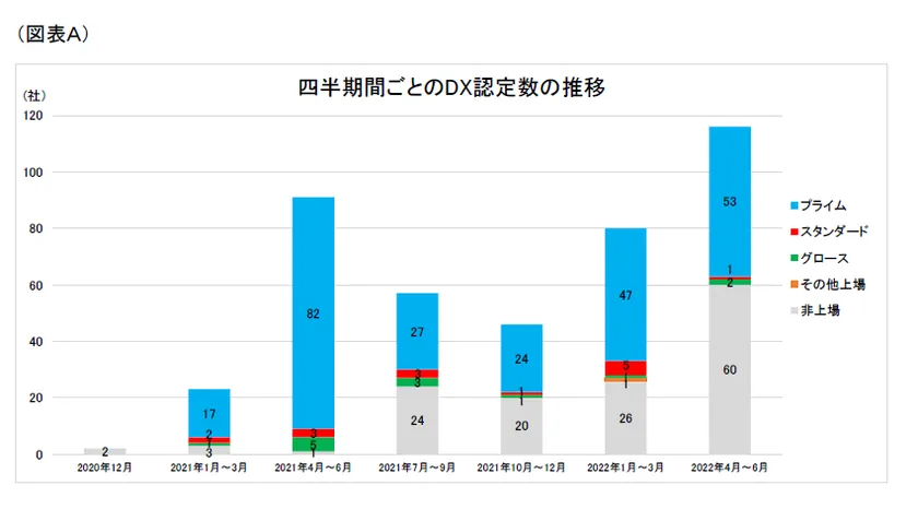 また、DX認定制度開始から1年が経過した2022年4月から6月においては、DX認定を受けた事業者における非上場企業の割合が過半数となっており、デジタル技術と明確な事業戦略を保持する非上場企業にも認定取得の動きが広がっている様子が表れています。