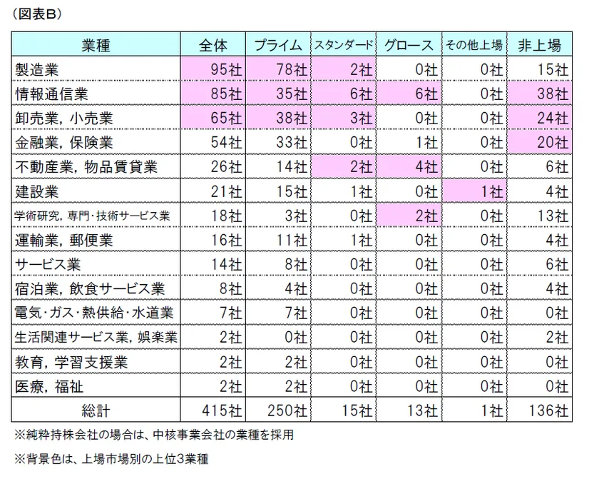 上場市場別の業種構成としては、プライム上場の「製造業」(78社)が最も多く、次点のプライム上場の「情報通信業」(35社)や「卸売業、小売業」(38社)の2倍超となっています。一方で、非上場企業においては、「情報通信業」(38社)が最も多く、「卸売業、小売業」(24社)、「金融業、保険業」(20社)の順となり、「製造業」(15社)は非上場の上位3業種に入りませんでした。