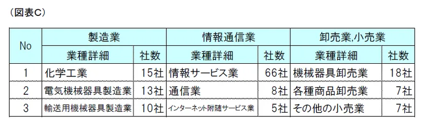 DX認定事業者の上位業種である「製造業」、「情報通信業」、「卸売業、小売業」の中分類業種(日本標準産業分類)を調査したところ、「製造業」では「化学工業」(15社)、「情報通信業」では「情報サービス業」(66社)、「卸売業、小売業」では「機械器具卸売業」(18社)が最も多い結果となりました。「情報通信業」において「情報サービス業」への偏りが大きいことが特徴的です。