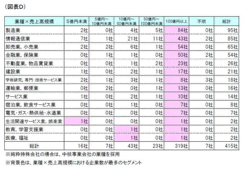 昨今のビジネス潮流において、事業運営へのデジタル技術の活用は、業種を問わず、全ての企業の必須条件となりつつあります。事業規模の大小に関係なくDXが浸透する業種こそ、成長が期待できる業種であるといえます。今後、売上高規模の小さい企業においても、DX認定の取得が進むことを期待します。(図表D)