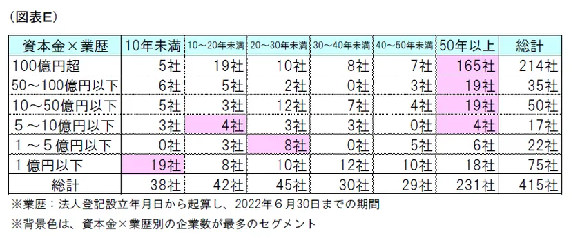 日本のインターネットやデジタル技術が1990年代以降に普及したことを踏まえると、業歴「50年以上」の企業は、デジタルを前提としないビジネスで設立し、現在のDX認定取得にまで至った先であるといえます。業歴「50年以上」の231社については、時代の変化を上手く捉えて対応することのできる企業であり、特に業歴「50年以上」かつ資本金「100億円超」の企業は、潤沢な資本体力を武器として、時代の変化に対して柔軟に対応できる企業といえます。(図表E)