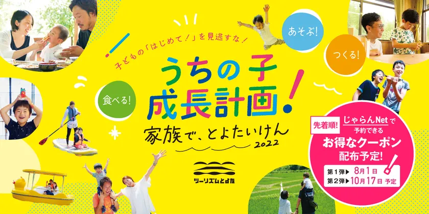 一般社団法人ツーリズムとよた(会長:太田 稔彦)は、コロナ禍で自宅で過ごすことが多かった子どもたちに、テレビゲームでは得られない、「はじめて!」のわくわく体験を楽しんでもらえる「豊田ならでは」の体験商品を揃えた、『うちの子成長計画!家族で、とよたいけん2022』キャンペーンを実施します。「じゃらん net 遊び体験」で販売する商品については、予約時に使える最大2,500円オフになるお得なクーポンを2022年8月1日(月)午前10時から配布します。また、夏休み期間に合わせて、『遊んで、学ぶ!親子で楽しむ夏休みWEBスタンプラリー』を開催します。