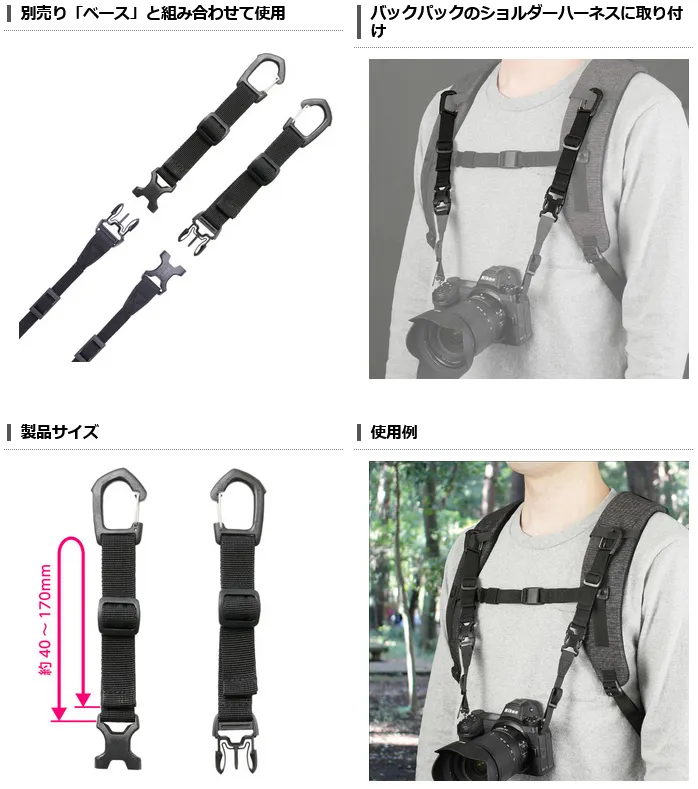 別売の「ベース(カメラ取り付けパーツ)」と組み合わせて、バックパックのショルダーハーネスにカメラを吊り下げて使用するパーツです。