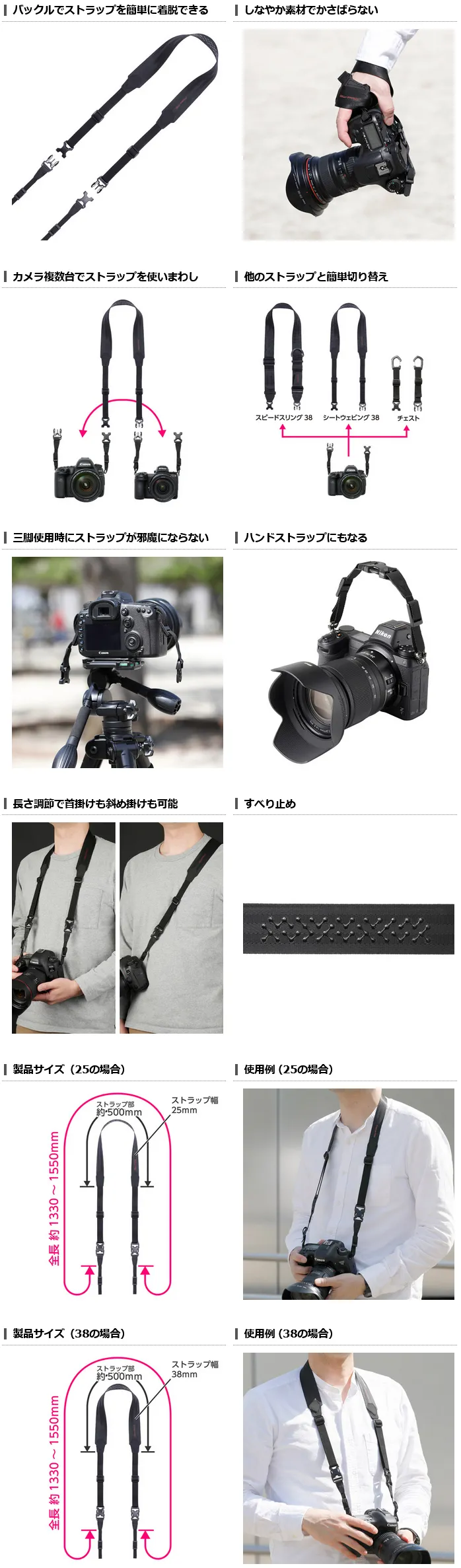 ショルダー部をバックルで簡単に着脱できるので、フード付きの服を着ている時や、電車内など身動きがとりづらい場所でも体からのストラップの付け外しが簡単に行えます。三脚使用時にもショルダー部が簡単に取り外せ、邪魔になりません。カメラを複数台持ち運ぶ際は、事前に「ベース」を全てのカメラに取り付けておけば、ショルダー部が1本あれば使い回しが可能です。