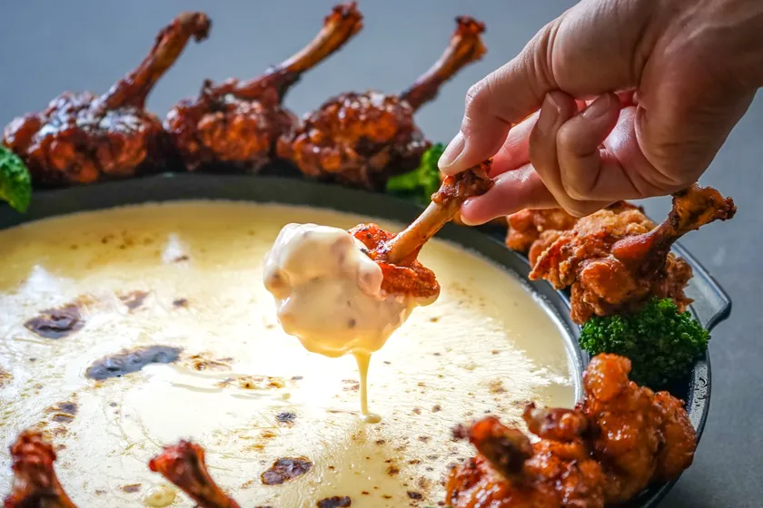 お食事には3種類の味付けがされた鶏手羽元のから揚げに熱々チーズを絡めてかぶりつく、毎回好評の「UFOチキン」ほか、ゆで豚と薬味を葉野菜で包む「ポッサム」や、特製だれで食べる「タッカンマリ」、「チーズチヂミ」など定番の韓国料理を含む計40種類以上が揃います。