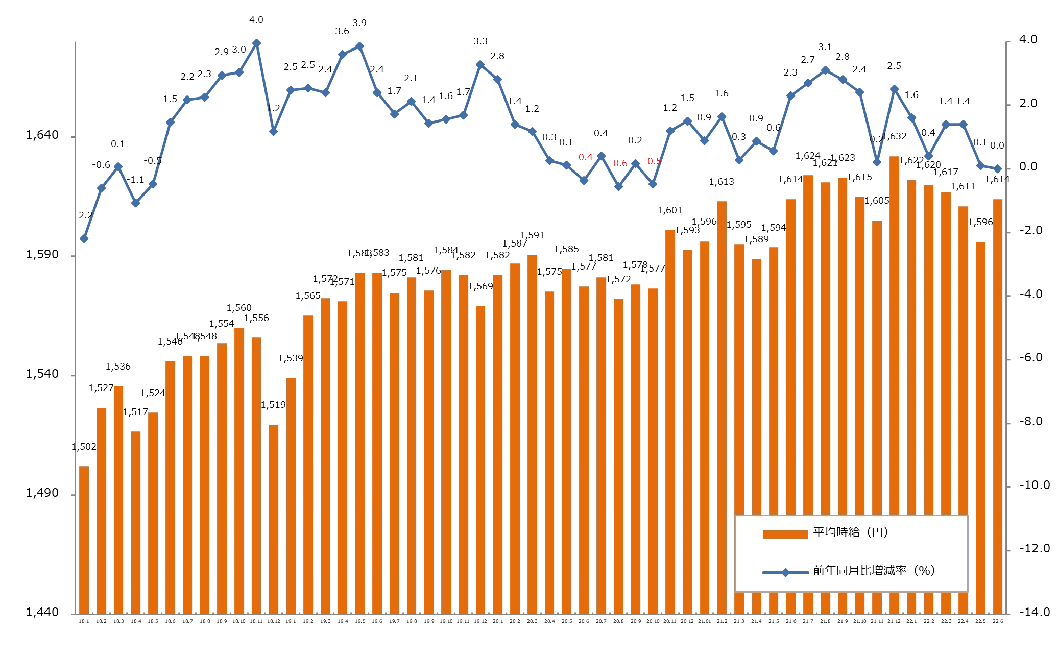 6月度の三大都市圏平均時給は、1,614円。前年同月比横ばい。
