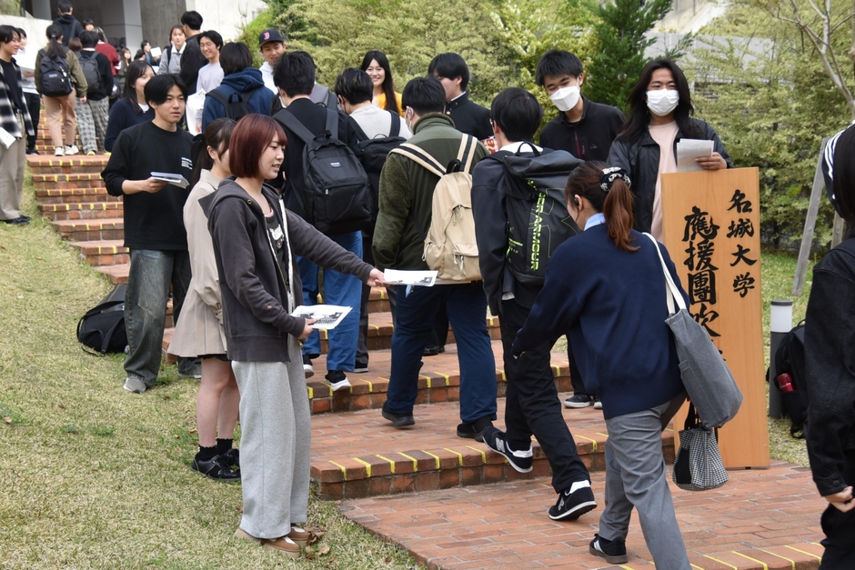 このほか、土日を除く4月16日まで、1限の講義が始まる前の8:30~9:00に研究実験棟Ⅳ前から共通講義棟東前までの間で勧誘ビラの配布も行われ、上級生たちがクラブ名など声を上げながらビラを配っています。また、天白キャンパス内では自動車技術研究会やバイクサークル、美術部などの展示も行われています。