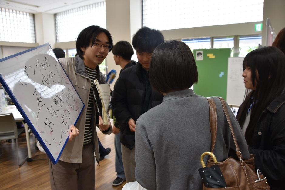 また、タワー75の2階学生ホールでは4月24日までの月曜日から金曜日に先輩たちに直接、質問ができるクラブごとの勧誘ブースが設けられ、活動の日時や内容などを質問する新入生でにぎわっています。さらに、各クラブの連絡先やSNS情報などがまとめられた掲示板前でも友人同士で話し合う1年生の姿が見られます。