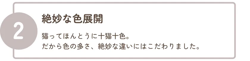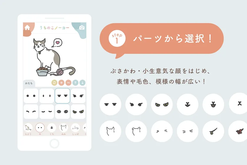 表情や模様などたくさんのパーツから好きなものを組み合わせて、自分だけの「うちのこ(ねこ)」を作ることができるWebアプリケーションです。社内の猫好きスタッフの「似顔絵メーカーの猫版があったらいいな」という声をもとに生まれました。