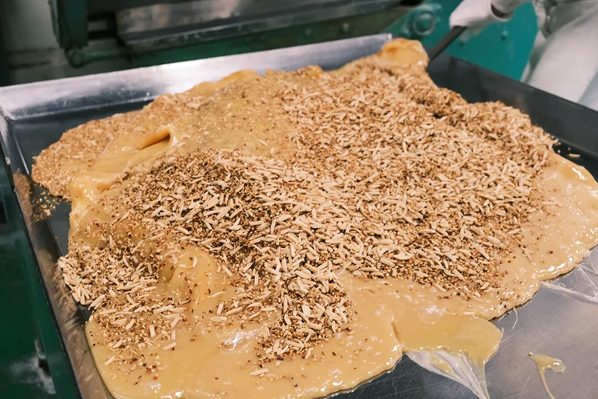 濃厚な飴に負けないアーモンドの香ばしさ、ザクザク食感を引き出すために手作業でアーモンドを沢山練り込みました。