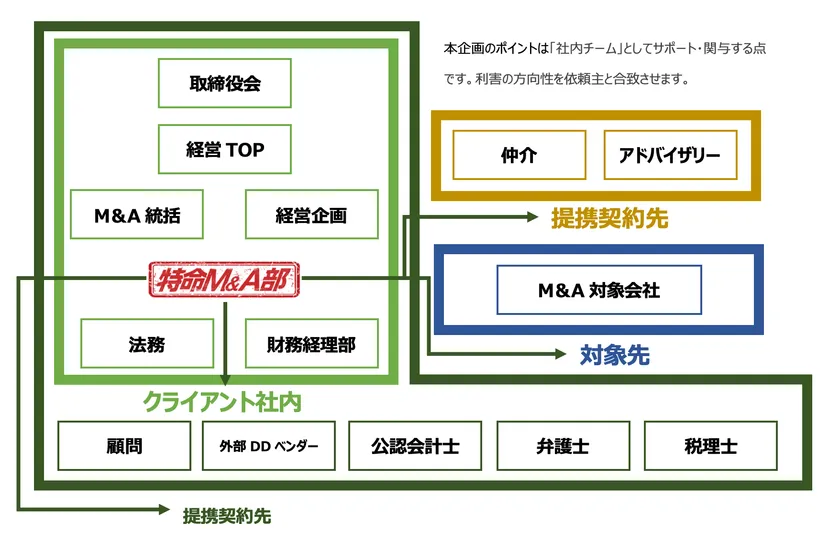 そこで当社は今般、M&A業界の活性化およびパートナー企業様の更なる価値創造のために、当社のこれまでの一連の実績を活かし発展させた、実務支援型M&A推進サービス「特命M&A部」を開始することといたしました。