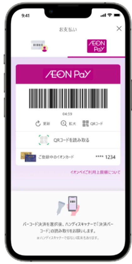 ※1:「AEON Pay」はイオンのトータルアプリ「iAEON (アイイオン)」をダウンロードいただき、イオンマークのカードを登録することで利用可能となります。イオンのグループ店舗をはじめとした全国のAEON Pay加盟店のレジにて、スマートフォンに表示されたコードを提示することで、簡単に決済することができます。