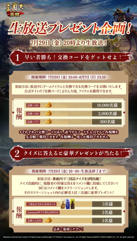 公式生放送中に、三国志にまつわるクイズを行います。その回答をYouTubeのコメント欄に記載した方の中から抽選で豪華賞品をプレゼントします。こちらもお見逃しなく!