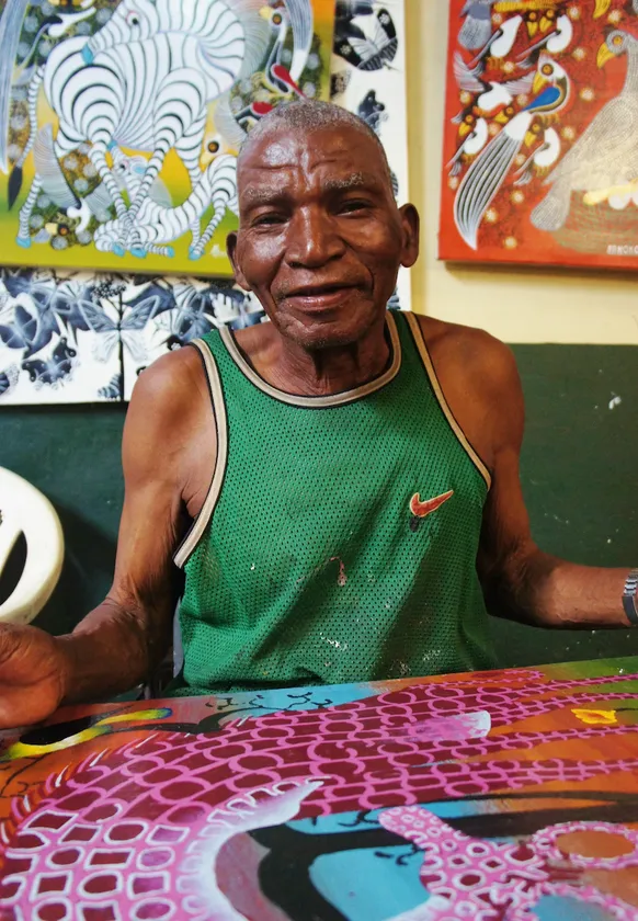 ジミー大西に絵を教えたことで日本では広く知られるようになったアーティスト。創始者にかわり長らくティンガティンガ村を率いたひとり。